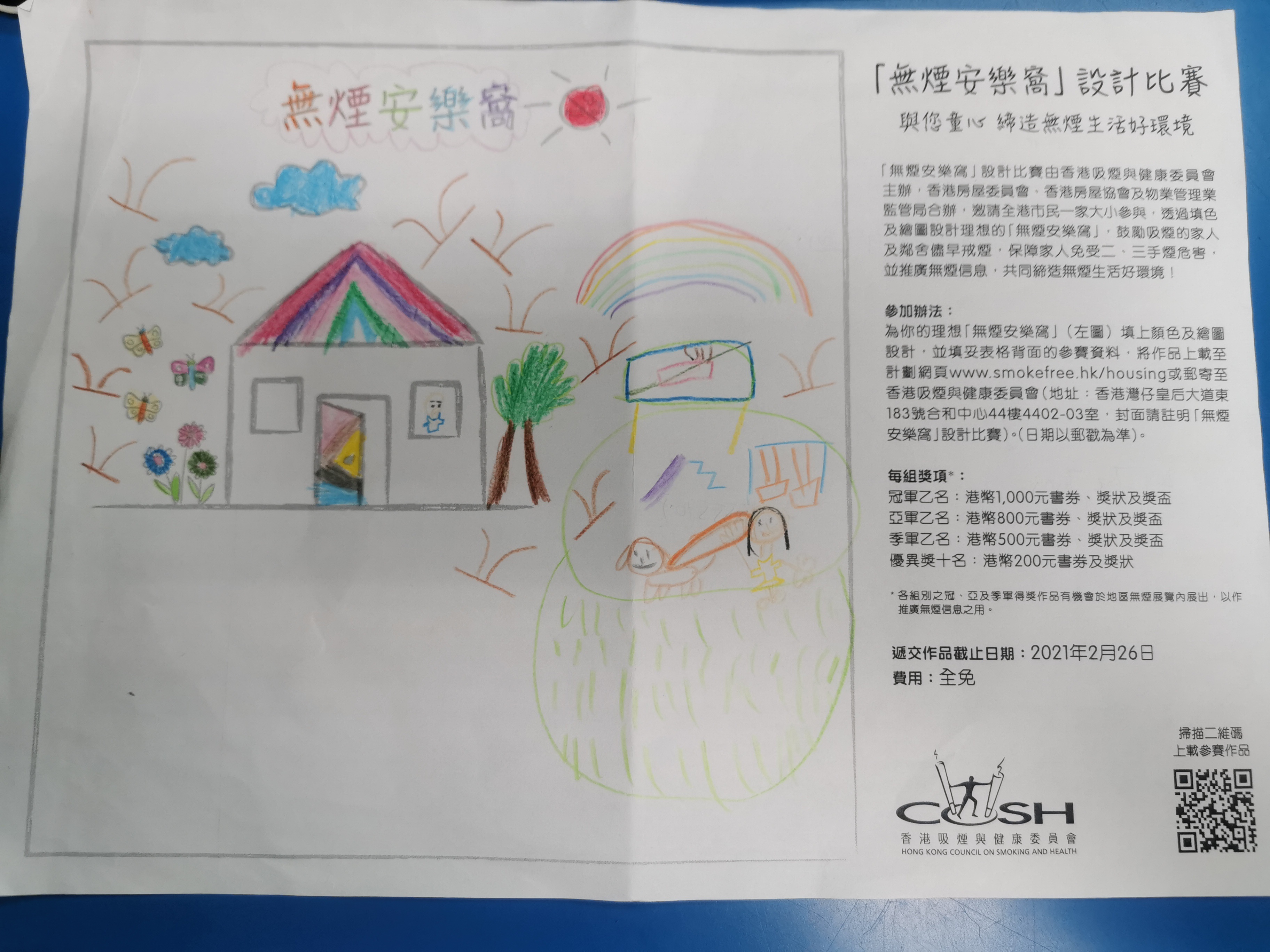 吸煙壞處多,影響家人健康,還能引起火災,催毀環境及家園。讓我們一起共建無煙環境,生活在優美的環境中,呼吸新鮮的空氣,享受大自然給予的一切,小朋友們能健康、快樂及愉快地成長。