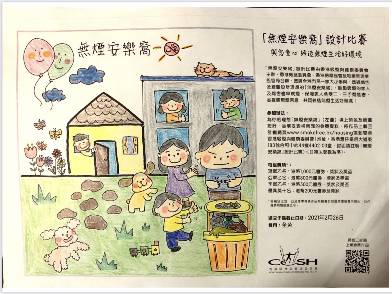 作品展示出只要大家都支持無煙生活,不吸煙,就會有一個美麗的環境開心生活,打造無煙安樂窩,家人都能夠喜氣洋洋~